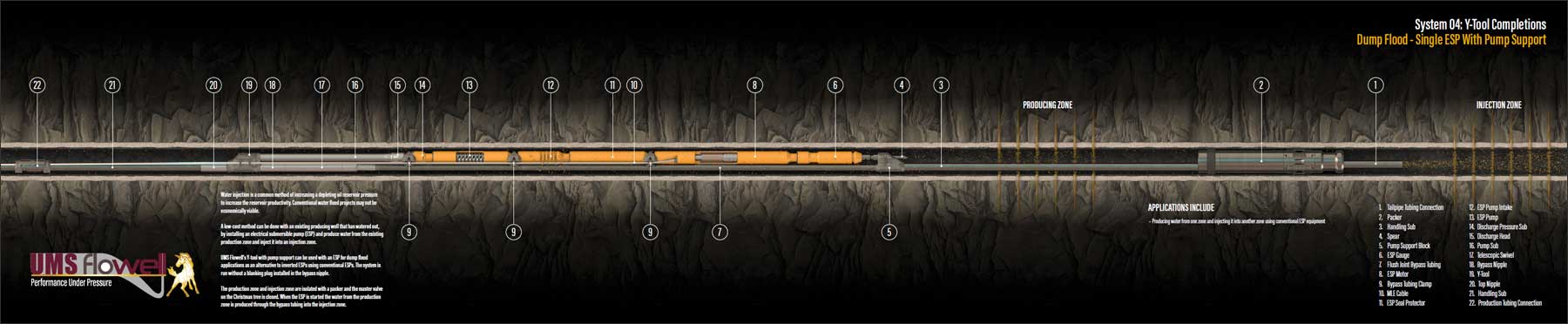 UMS Flowell’s Y-tool with pump support can be used with an ESP for dump flood applications as an alternative to inverted ESPs using conventional ESPs. The system is run without a blanking plug installed in the bypass nipple.
