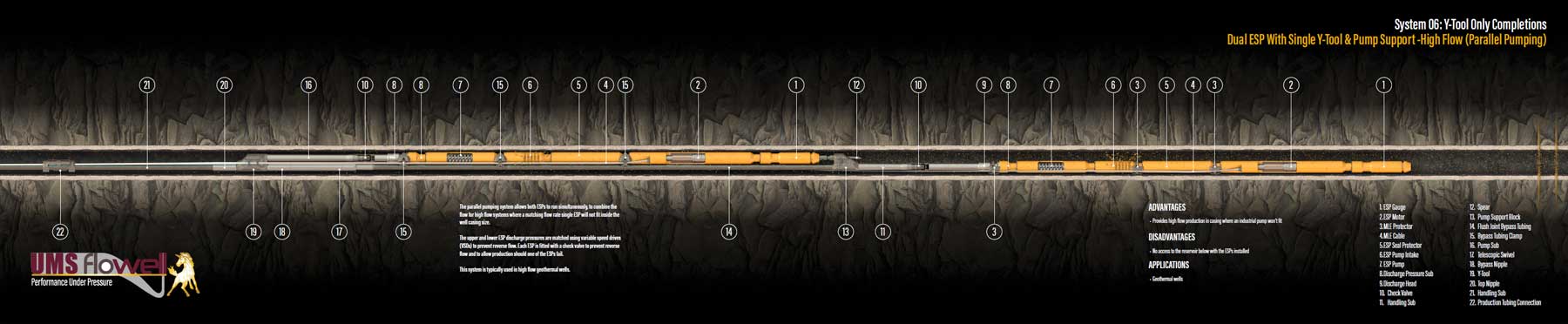 The parallel pumping system allows both ESPs to run simultaneously, to combine the flow for high flow systems where a matching flow rate single ESP will not fit inside the well casing size.