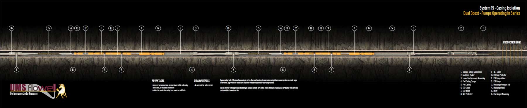 By operating both ESPs simultaneously in series, the dual boost system provides a high horsepower system to create large drawdown, to provide the necessary boost for wells with depleted reservoir pressure.