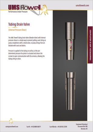 The UMS Flowell Tubing Drain Valve (Bleeder Valve) with internal pressure shear is a simple way to prevent pulling a wet string on pump completions with a check valve, or pump strings that are blocked with sand and debris.