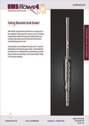 UMS Flowell’s Tubing Mounted Junk Basket is an integral part of the completion tubing string that is used as a means of catching dropped debris between the casing and tubing annulus, such as broken cable bands, bolts and other items that have been accidentally dropped into a well.